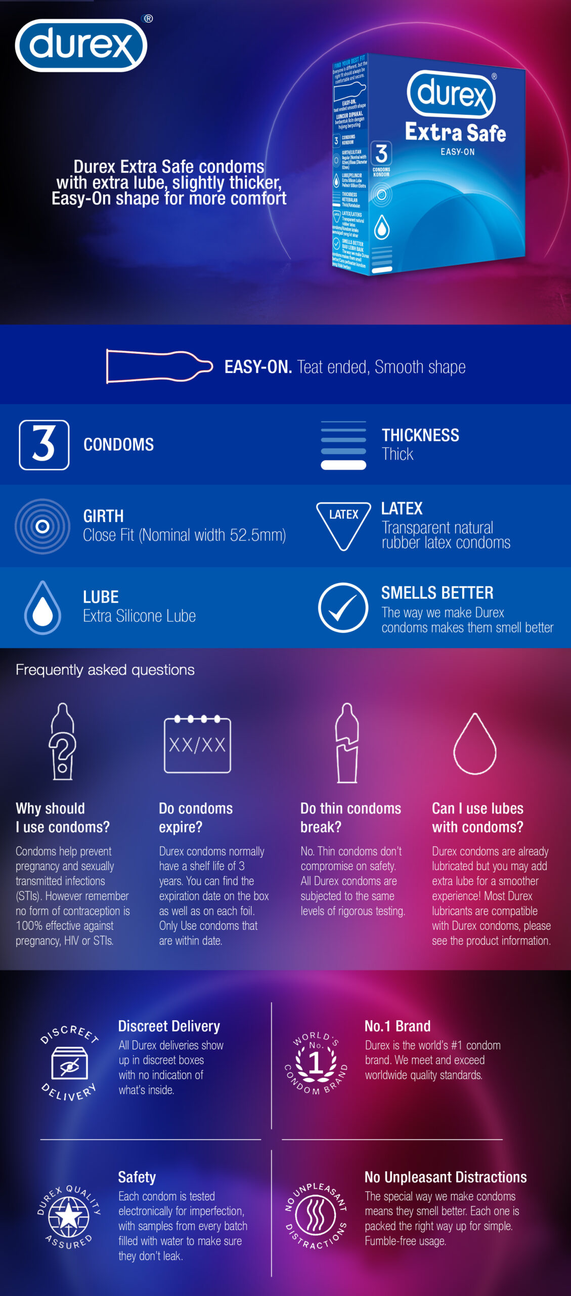 Slightly thicker, with extra lubrication, Durex Extra Safe is designed for those who want the ultimate reassurance without having to sacrifice comfort. Durex Extra Safe is designed for those who want peace of mind in knowing that the condom they are using is safe. Durex Condoms Quality. Durex condoms don’t just meet worldwide quality standards, they exceed them. Easy-On. Specially shaped to be easier to put on and more comfortable to wear. Sensi-fit condom Durex sensi-fit condoms are specifically designed to offer a greater feeling where you want it most. Smells better The special way we make our condoms means they smell better. Extra Safe Slightly thicker, with extra lubrication, Durex Extra Safe is designed for those who want the ultimate reassurance without having to sacrifice comfort. Durex Extra Safe is designed for those who want peace of mind in knowing that the condom they are using is safe.