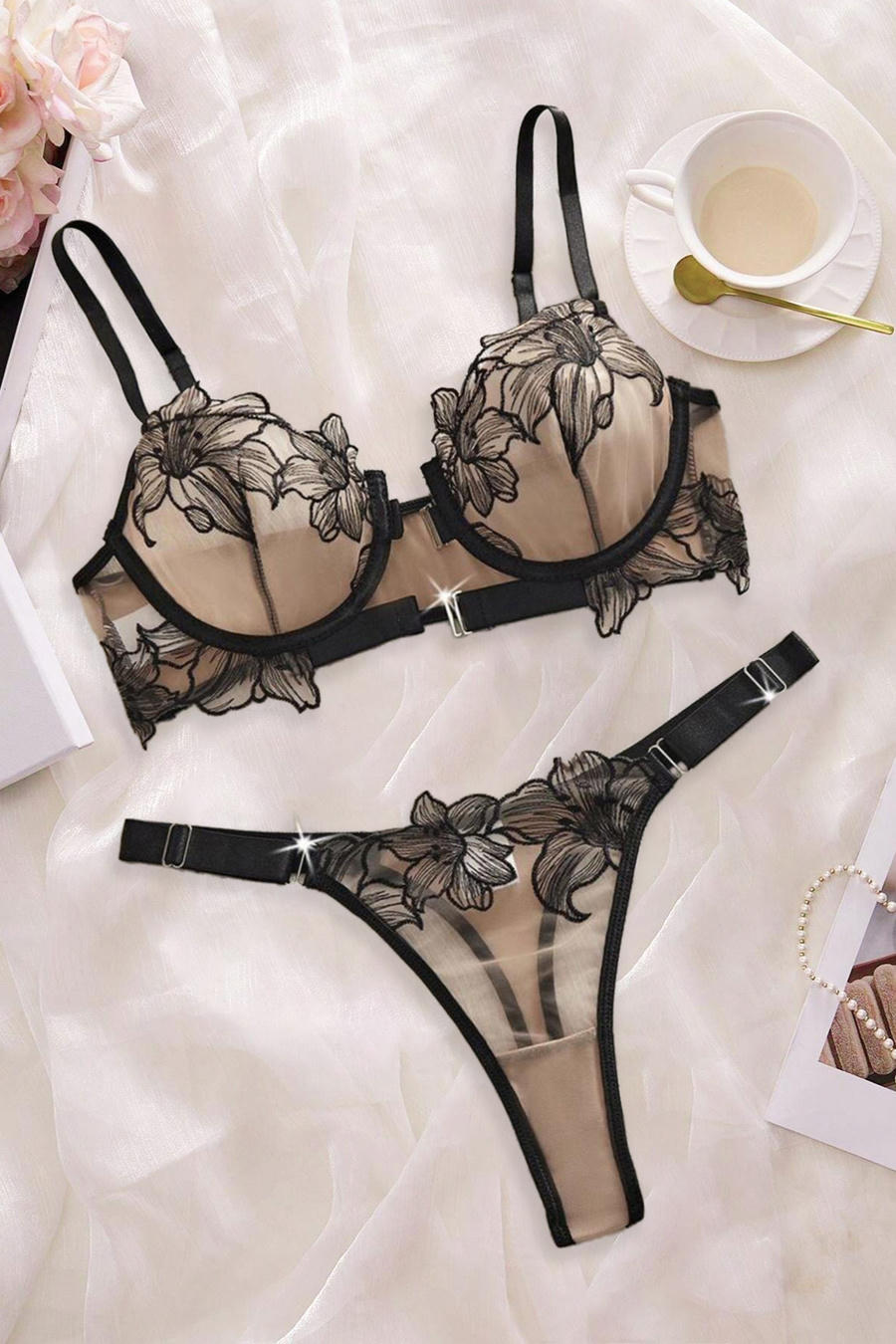 Sexy slight stretch flower embroidery mesh with underwire cutout two-piece set