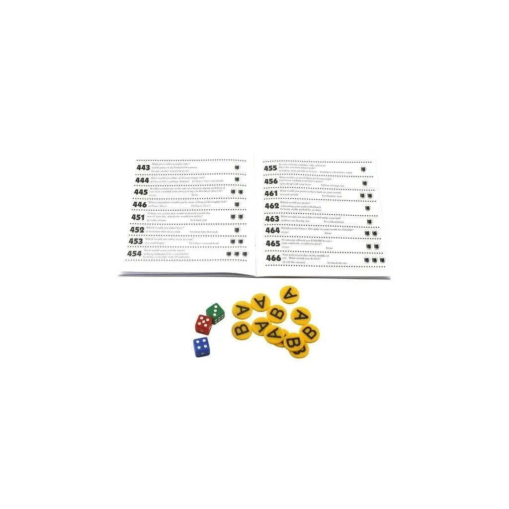 - Players take turns rolling 3 dice, which represent the question they will be responding to. The player who rolled secretly chooses one of the two provided answers and the rest of the players submit their A/B tokens (or coins in larger groups) with what they think their friend has chosen. Anyone who guessed their friend’s vote incorrectly downs that question’s penalty drinks, and the crazier the question, the stiffer the penalty!